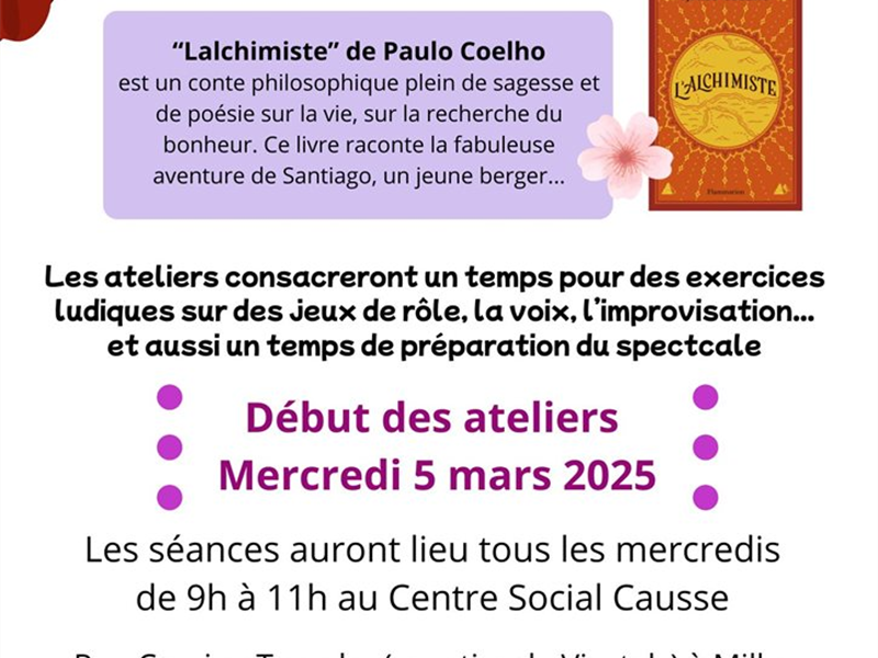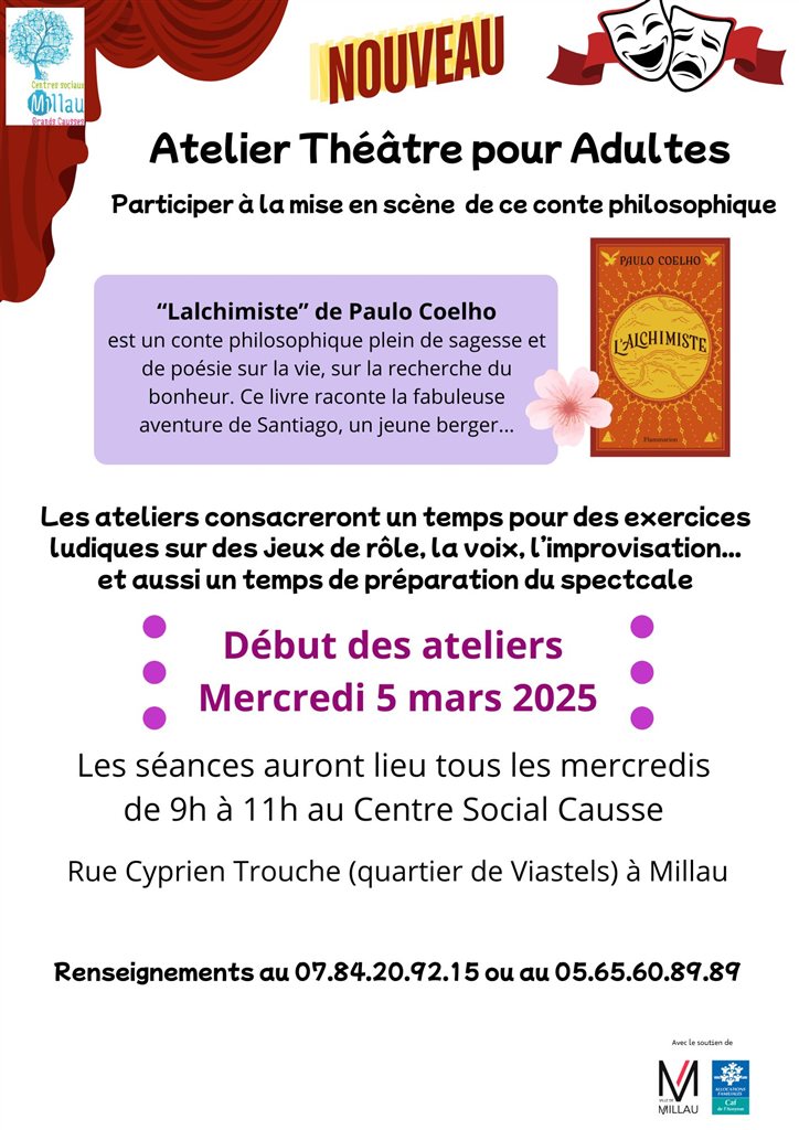 Atelier de Théâtre pour les adultes NOUVEAU Venez intégrer ce nouvel atelier... Renseignements auprès de Fanny au Centre Social Causse : 05.65.60.89.89 Partager 11 février 2025