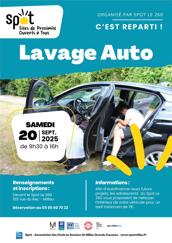Lavage auto Samedi 20 sept. au Spot Le 260. Les ados nettoient l'intérieur de votre voiture. 7€/voiture. Réservation au 05.65.60.70.22 Partager 11 septembre 2025