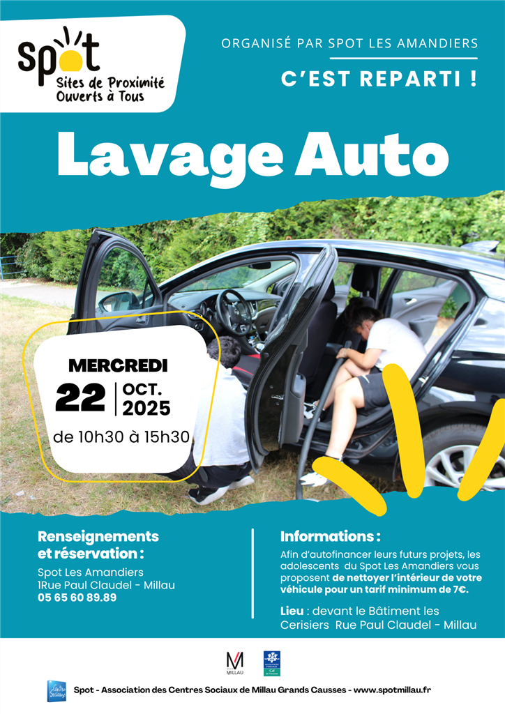 Lavage auto Mercredi 22 Oct. au Spot Les Amandiers de 10h30 à 16h. Tarif : 7€/ véhicule. Les ados nettoient l'intérieur de votre voiture. Inscription au 05.65.60.89.89. Prévoir créneau 30 min. Possibilité d'attendre sur place. Partager 16 octobre 2025