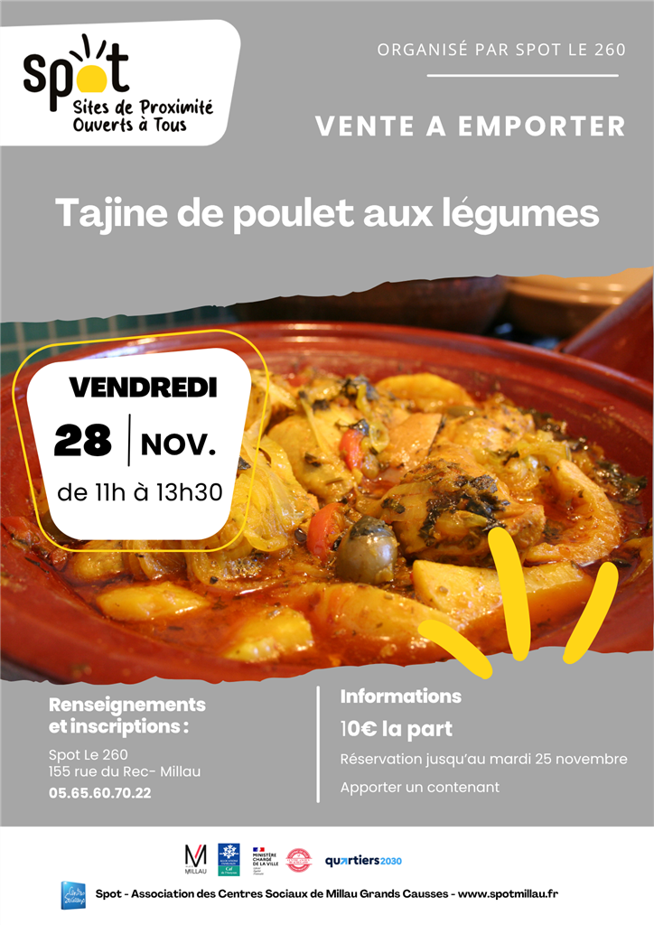 Vente de Tajine Vendredi 28 novembre, dans le cadre d'un projet d'autofinancement séjour, quelques femmes prépareront un Tajine au poulet à emporter. 10€/la part. Amener votre contenant. Réservation au Spot Le 260 : 05.65.60.70.22 Partager 5 novembre 2025