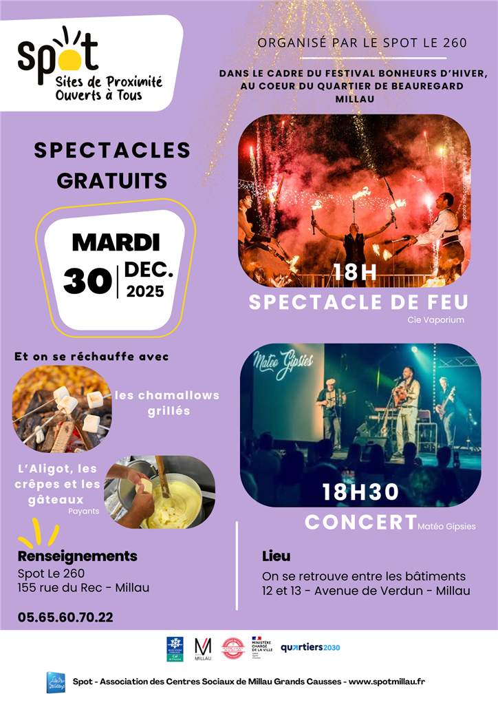 Beauregard en Fête Mardi 30 décembre, fin de journée festive Avenue de Verdun à Millau. Spectacles de feu et concert des Matéo Gipsies de 18h à 21h. Sur place, vente Aligot, gâeaux et crêpes. Partager 11 décembre 2025