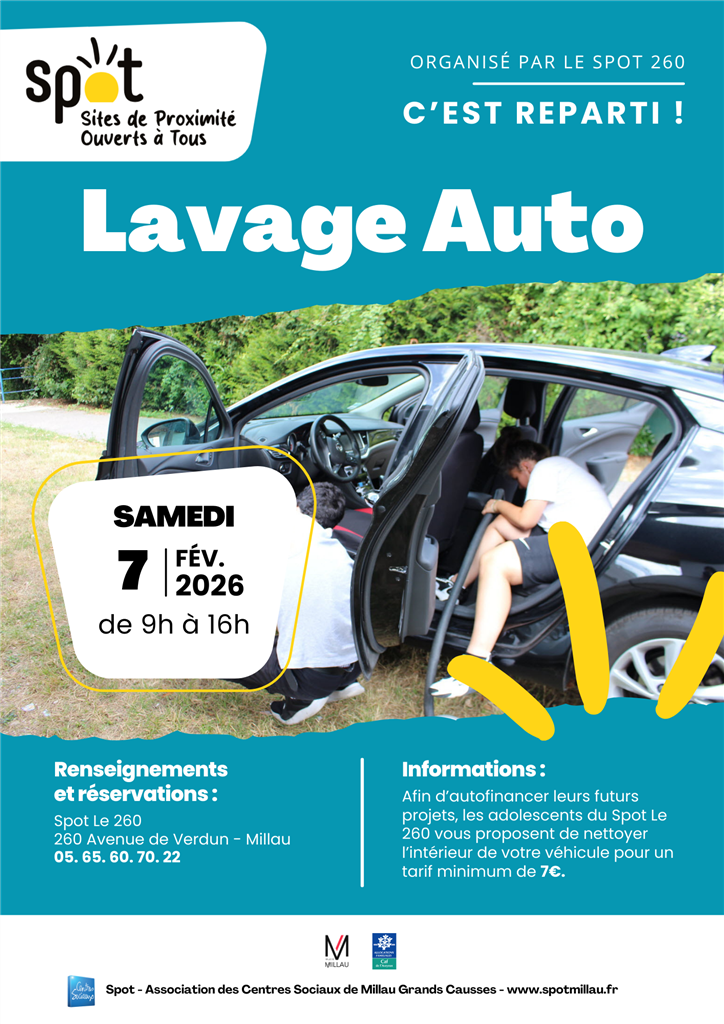 Lavage auto Samedi 7 février. Au Spot Le 260, avenue de Verdun. Réservation au 05.65.60.70.22. Prix 7€/voiture. Partager 27 janvier 2026