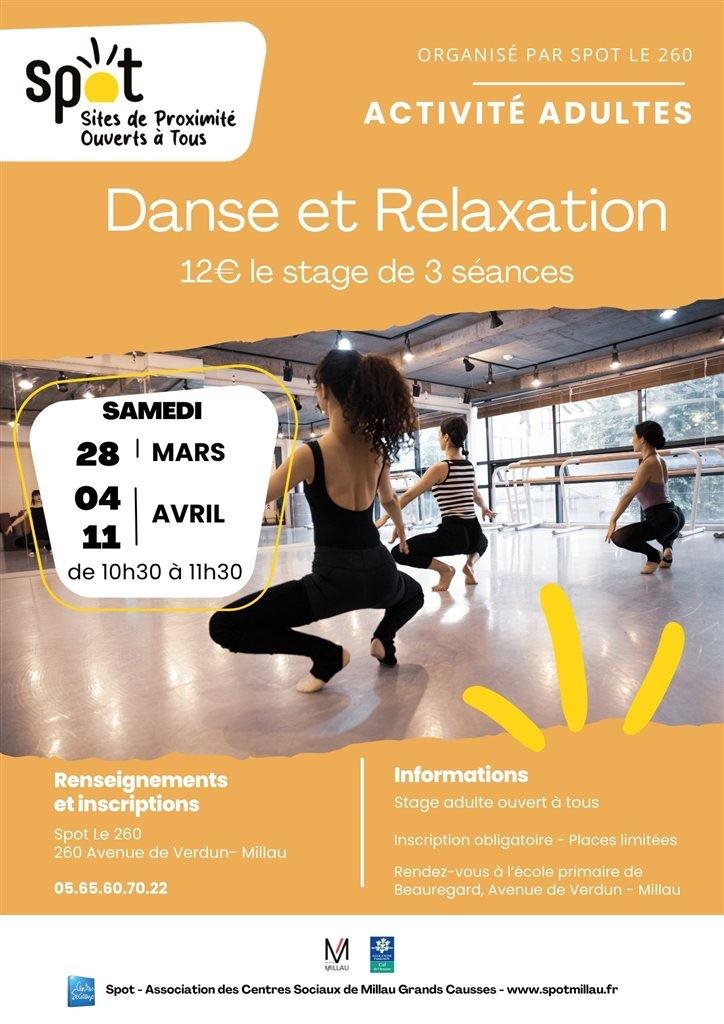 Danse et Relaxation Stage de 3 séances, pour les adultes. Ouvert à tous. Tarif : 12€/le stage. Horaire : de 10h30 à 11h30 Samedis : 28 mars, 4 avril et 11 avril 2026. Rendez-vous à l'école de Beauregard à Millau. Inscription obligatoire au Spot Le 260, Avenue de Verdun - Millau. Tél : 05.65.60.70.22 Partager 19 mars 2026