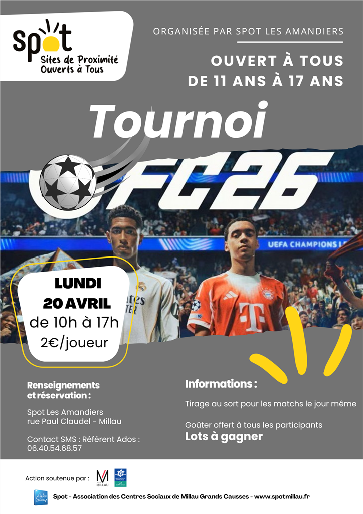 Tournoi Fifa Au Spot Les Amandiers - Millau. Tournoi de foot PS pour les ados de 11 à 17 ans. Tarif : 2€ la journée. Ouvert à tous Contact : référent ados : 06.40.54.68.57 Partager 2 avril 2026