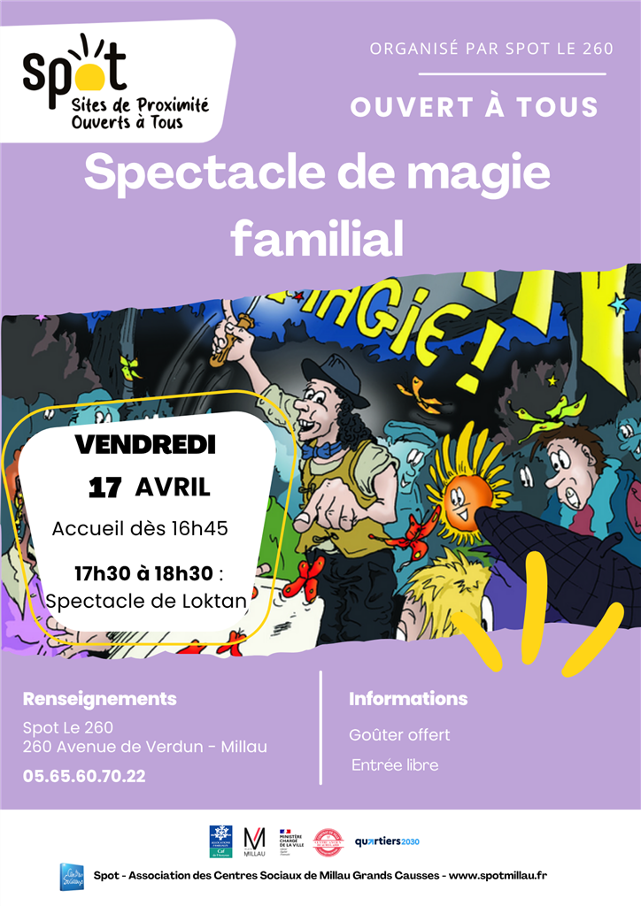 Spectacle de magie familial Vendredi 17 avril, au SPOT Le 260, un spectacle de magie gratuit et ouvert à tous. Ouverture des portes dès 16h45 pour le goûter et spectacle à 17h30 avec Loktan. Contact SPOT Le 260 : 05.65.60.70.22 Partager 16 avril 2026