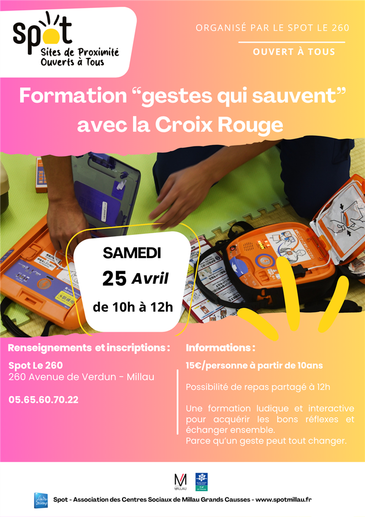 Les Gestes qui sauvent Samedi 25 Avril, au SPOT Le 260, Formation avec le soutien de la Croix Rouge, ouverte à tous à partir de 10 ans. Venez en famille, vous formez aux gestes qui sauvent. 15€/personne. Inscription : 05.65.60.70.22 Partager 16 avril 2026